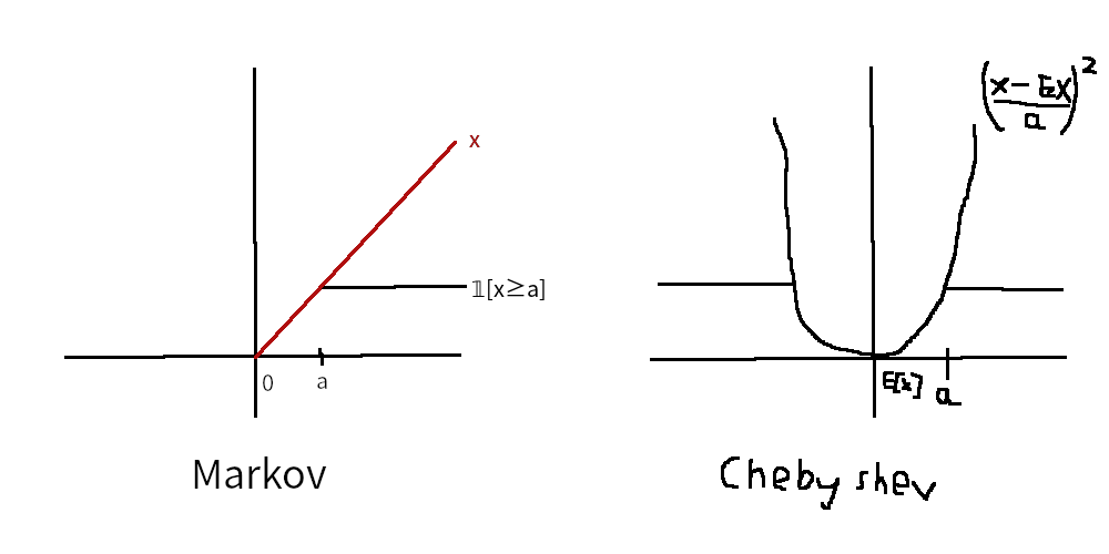 \[\Pr[X\geq a]=\E[𝟙_{X\geq a}]\leq\E[X/a]=\E[X]/a\]If $c=\E[X]$ and $f(x)=((x-\E[X])/a)^2$ (the quadratic that passes through $(\E[X]+a,1)$), then we get Chebyshev’s inequality as